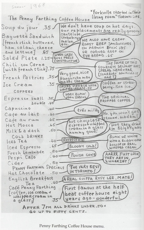 I’m currently reading “Making the Scene: Yorkville and Hip Toronto in the 1960’s”, by Stuart Henderson (Yorkville was Canada’s Haight-Ashbury). In the book is a photo of this entertaining 1968 menu from The Penny Farthing, a long since extinct coffeehouse: