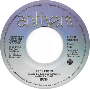 Well, that’s not exactly the case with “Red Lenses,” as it’s a Rush song that’s still obscure, and not even well–liked (if its known at all). As a Nebraska newspaper review said at the time: “The biggest disappointment of the album is Red Lenses, in which [Geddy] Lee attempts some heavy metal rap music. It could have easily been left out.” I don’t hear it that way at all though…(“heavy metal rap music”?) For me, it’s a cool and unusual little song, unique in a number of regards.